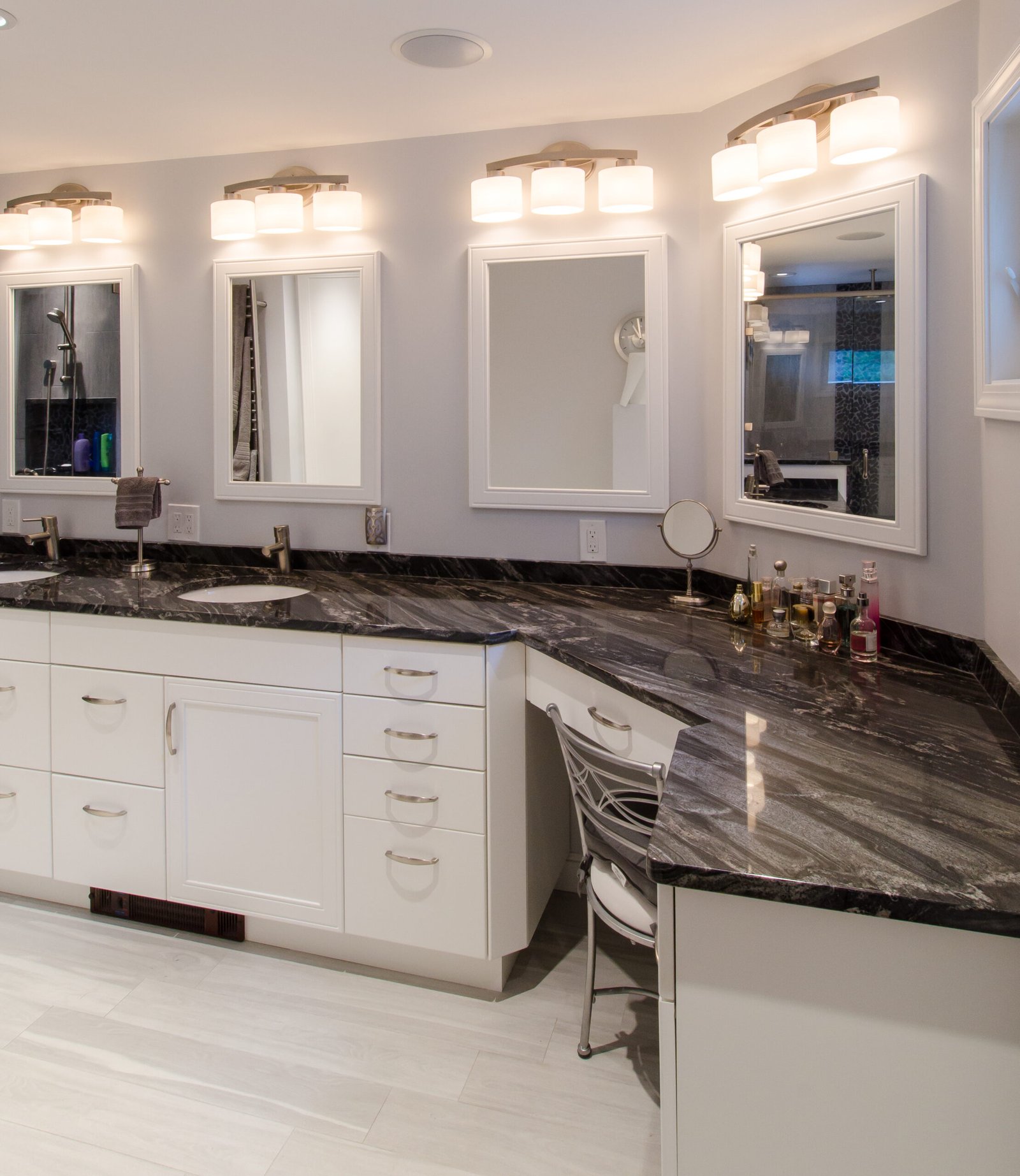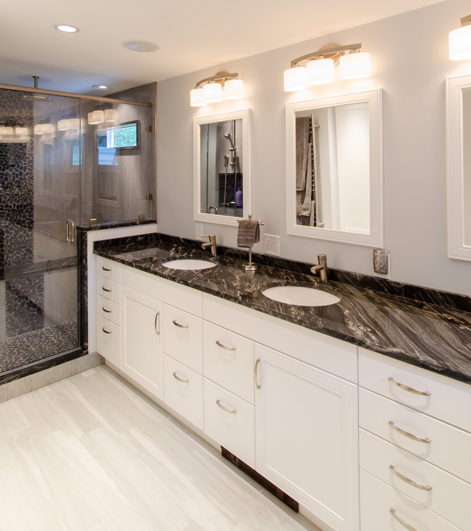 White painted vanity with dark granite countertop provide a stunning contrast to this Acton MA bathroom remodel.