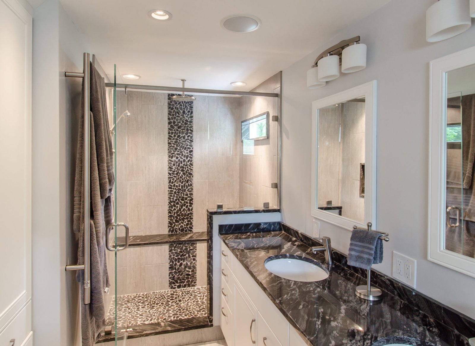 In summary – White cabinetry dark granite countertop gives a beautiful color contrast in this Acton MA bathroom remodel. Large vanity with corner make up space provides great usable countertop along with lots of drawer storage. Custom tile shower with glass doors, bench seat and pebble accent strip going into the floor provides a stunning look.  Matching linen closet with custom pull out hamper is a fabulous addition to this Acton MA bathroom remodel.