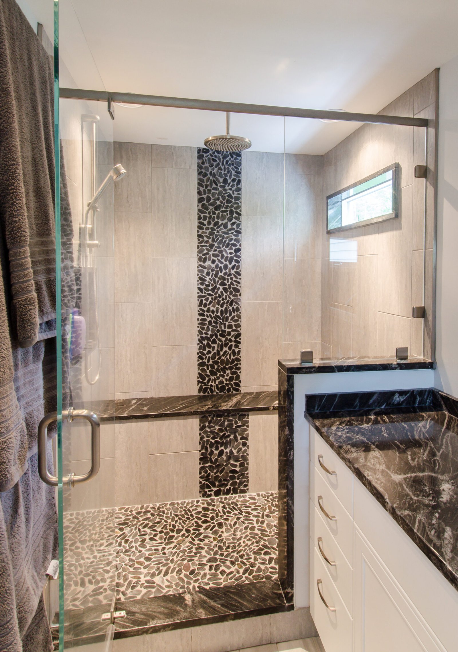 Large tile shower with a bench seat and a pebble tile vertical accent strip which flows into the pebble tile on the floor of the shower.