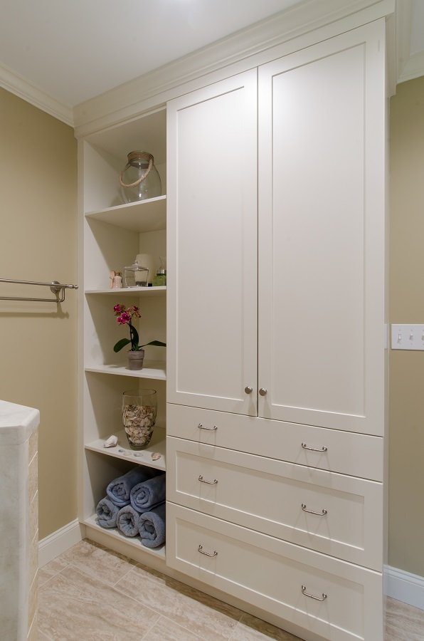 In summary – Large bathroom remodel in Dunstable MA is a beautiful addition to this home. Large corner tile shower with two recessed soap dispensers and a glass door. Built in linen closet with drawer storage on the bottom. Vanity with double sink and drawer storage is a great addition to the bathroom space. Wall cabinet hung in the center above the vanity is a perfect replacement for a medicine cabinet.