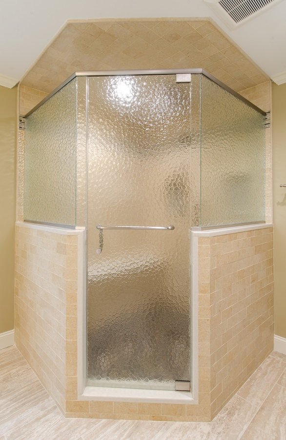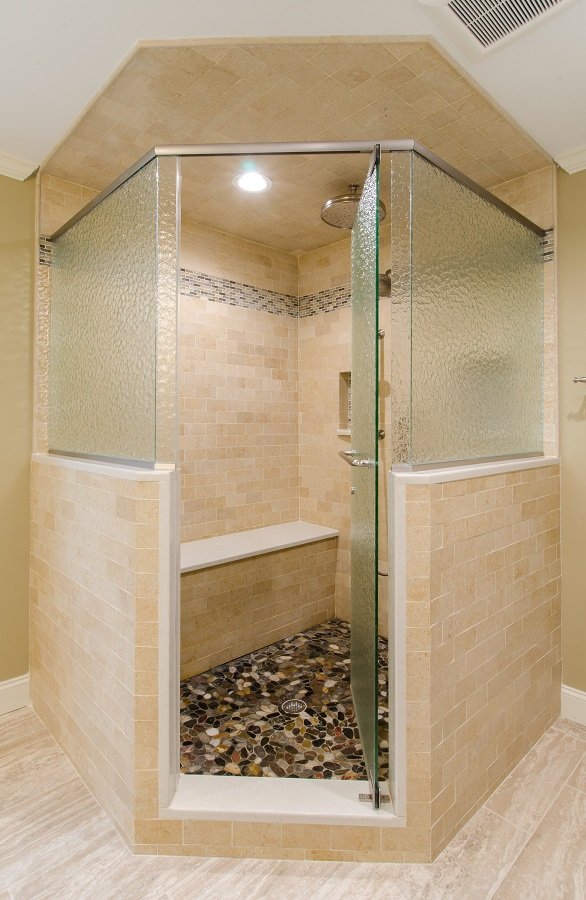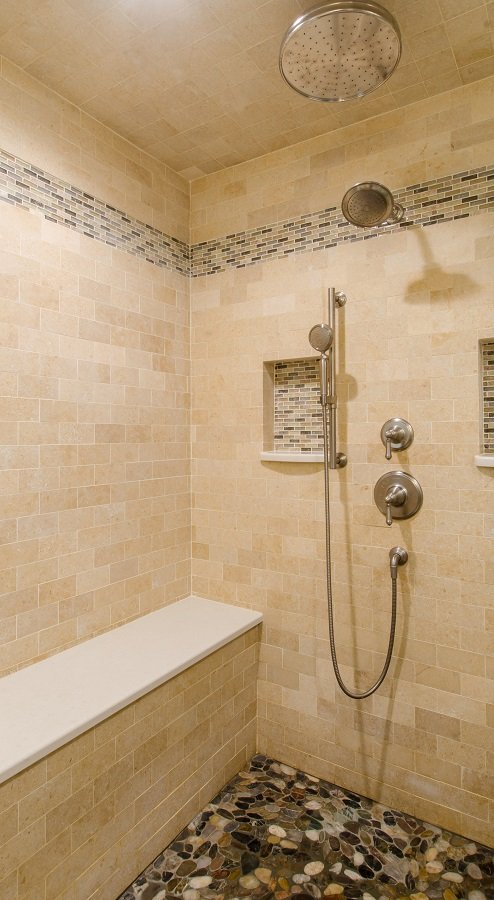 • Tile corner shower with bench seat is not only a great use of space but gives the homeowner a very large shower.