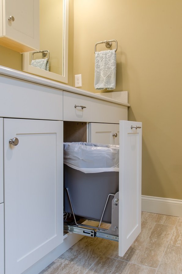 • Pull out trash built into vanity is a great place to hide the bathroom trash.