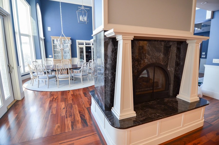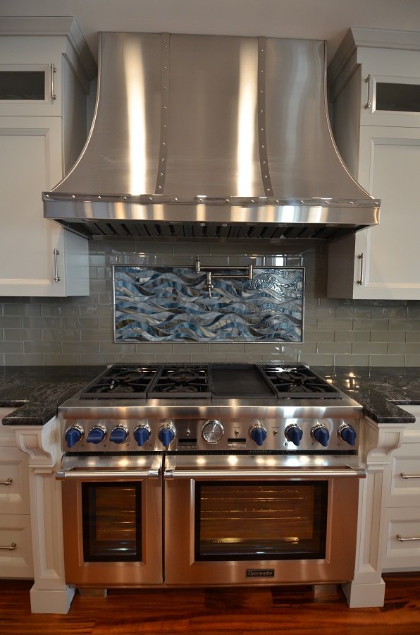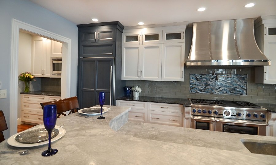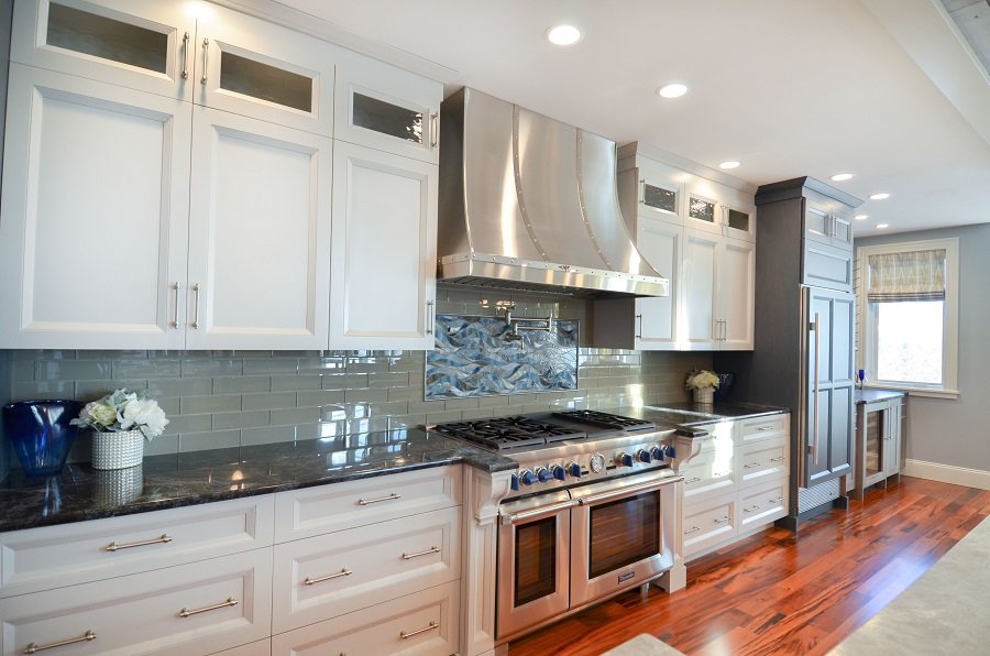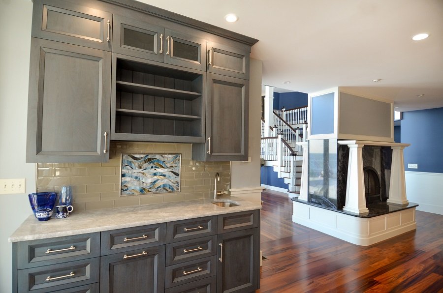 In Summary- This Beach Style Kitchen Remodel York ME is equipped of functional white and blue cabinets complimented by a backsplash that illuminates the surrounding beach environment. The large island stretches across the kitchen to provide maximum prep space for cooking and entertaining guest. There is a built in stainless steel sink and new dishwasher in the island which create a comfortable flow when manuring around the kitchen. There are two different types of casual seating built into the island and a formal dinning area along side the open concepts kitchen. The kitchen is full of plenty of storage space in the wall to wall cabinets to keep your kitchen appliances organised. In the corner of the kitchen there is a section dedicated for all of the homeowners bar needs. The hanging wine racks are not only functional but displays the homeowners wine collection. This remodel is fully functional and compliments the rest of the updated beach house! |