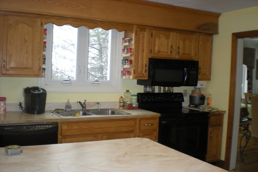Traditional framed wood cabinetry with laminate countertops date this Tewksbury MA kitchen.