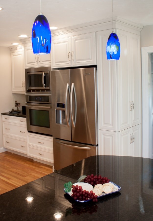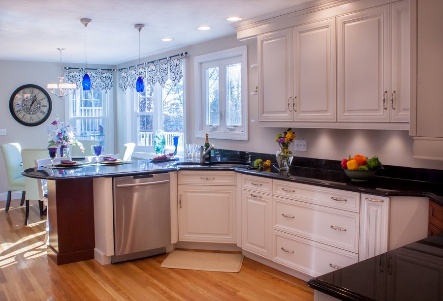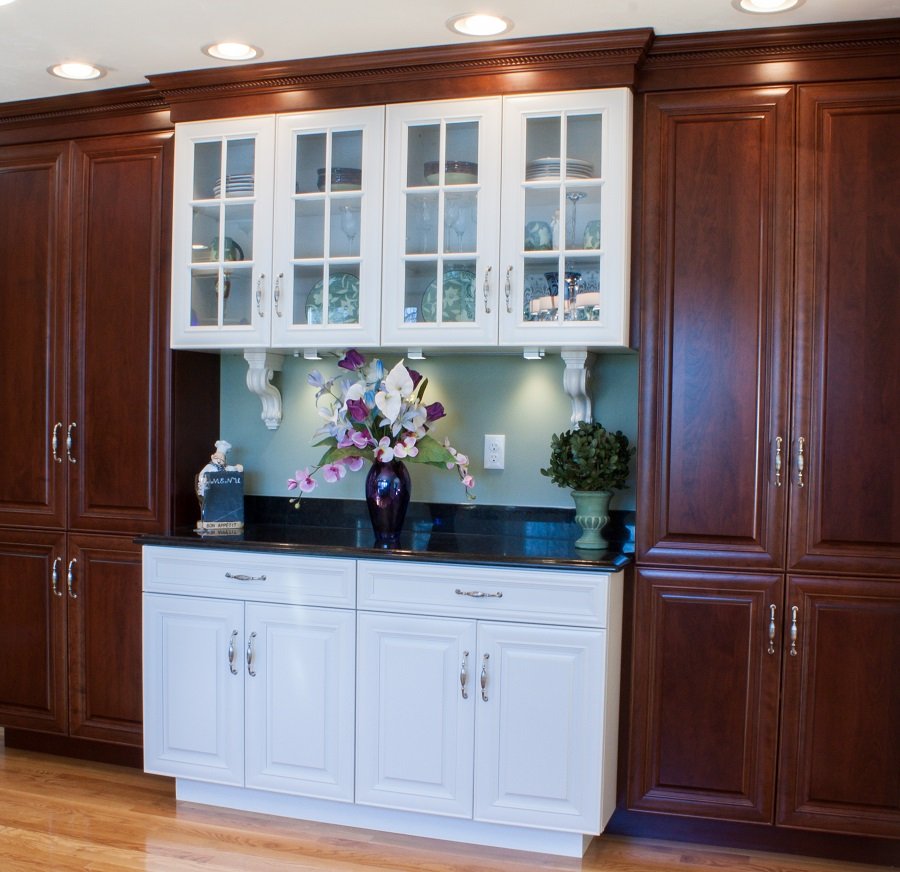 In summary – This Tewksbury MA kitchen went from an older style traditional kitchen with laminate countertops and framed cabinets to a a stunning two toned traditional kitchen of today. Relocating both the sink and the countertop provides more storage space along with considerably more useable countertop space. Adding a buffet/ china cabinet is a great place for extra storage or for placing food or drinks out for large parties.