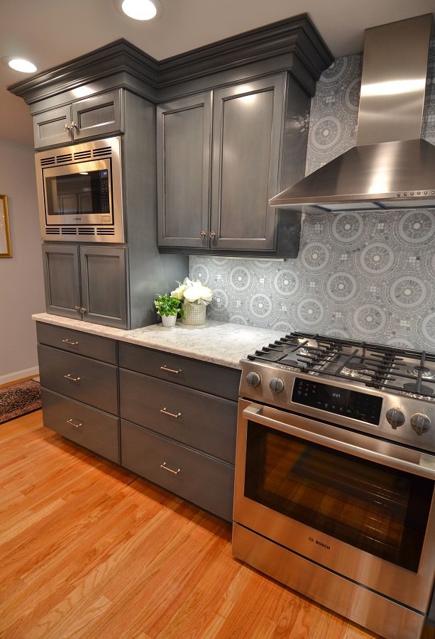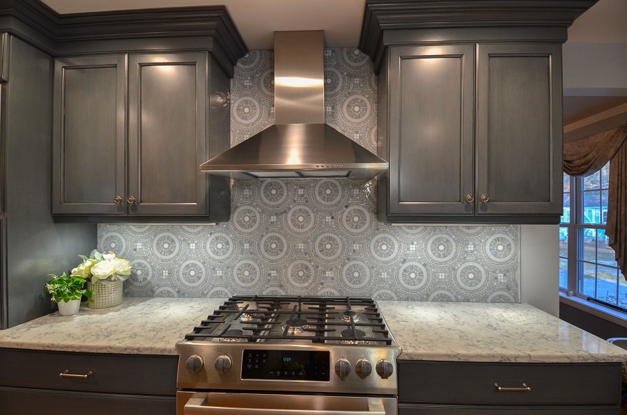 Gorgeous backslash behind the range and bar that matches the rest of the blue and gray kitchen.