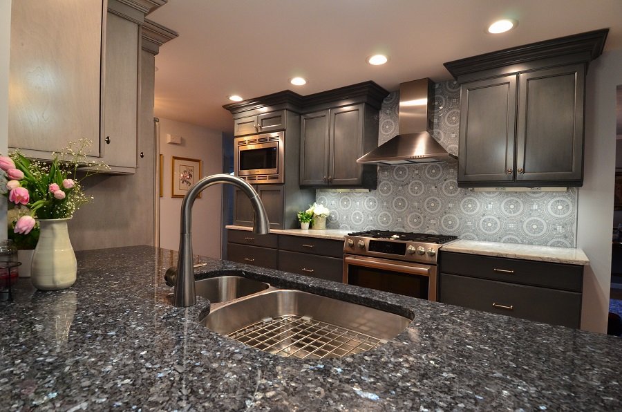 Dual waste tucked away in the blue and gray cabinets to keep the smell down and open up the floor plan in the kitchen remodel.