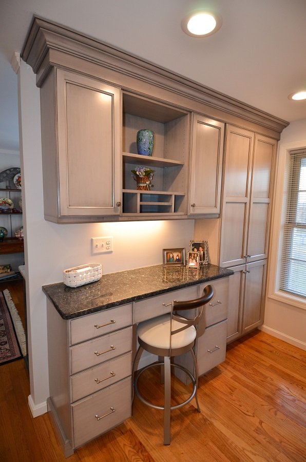 Office nook is incorporated into the kitchen remodel to match the rest of the cabinets and make the first floor of the home unified and functional.