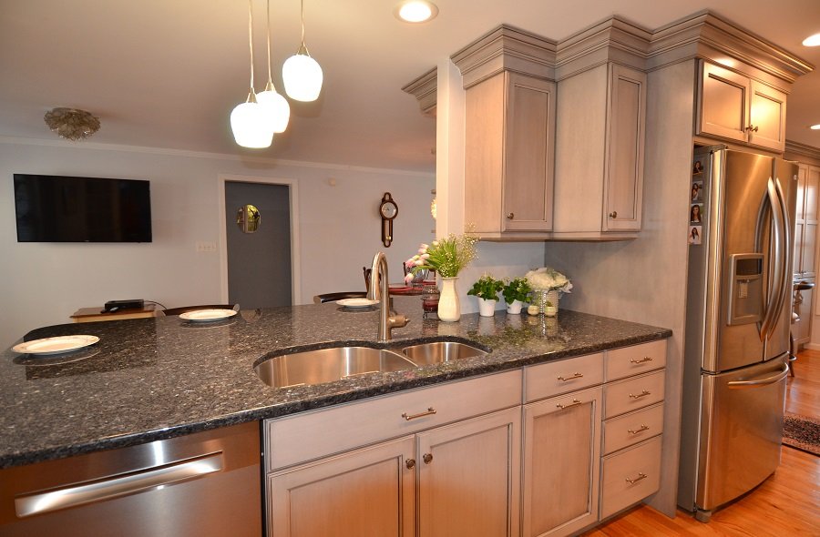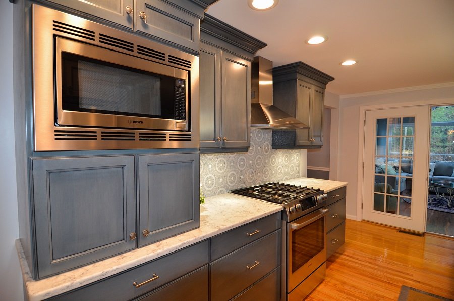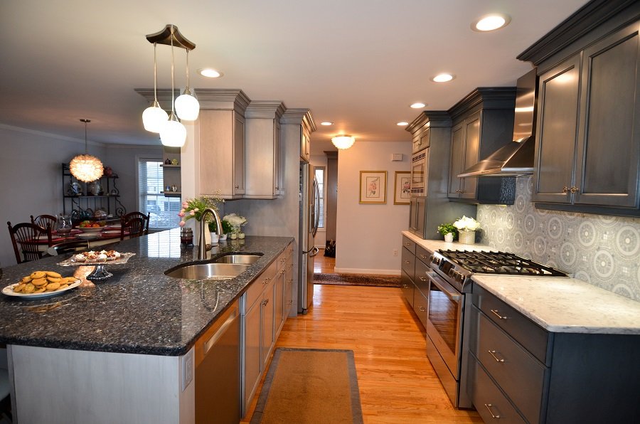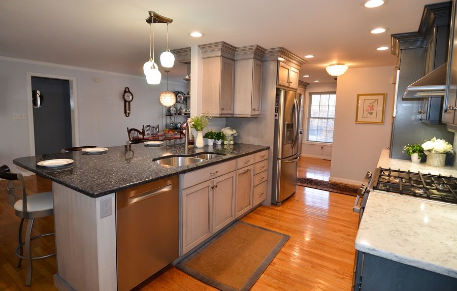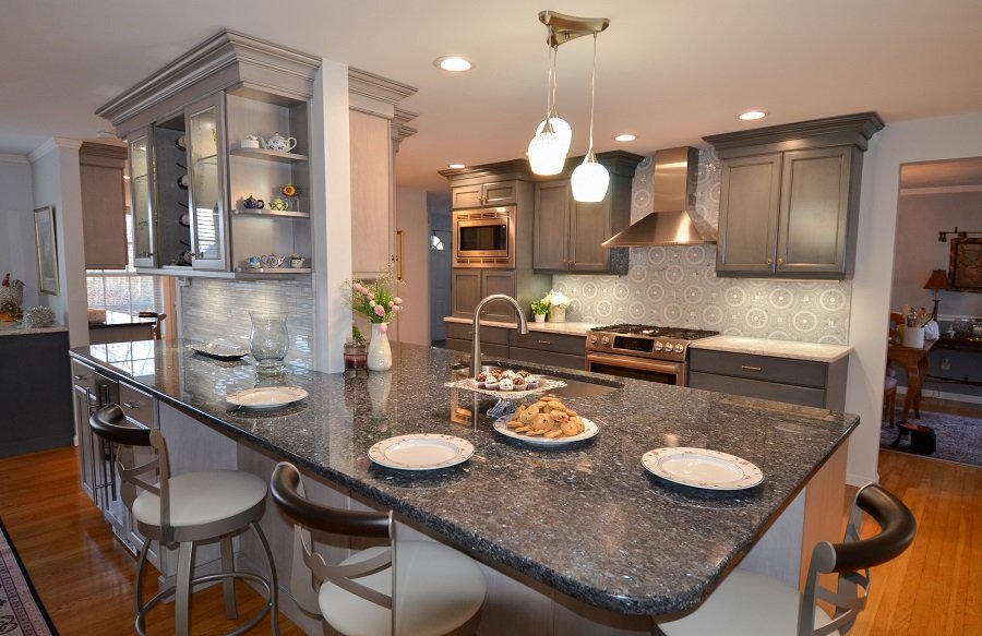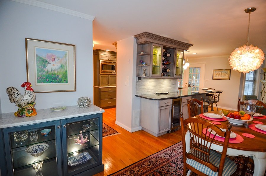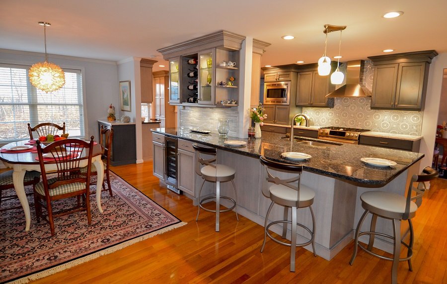 In Summary- In this stunning transitional Blue and Gray Kitchen Remodel design, Tyngsborough MA the blue and gray motif weaves throughout the layout. In the center of the room the designer incorporate a load barring wall into the design. Instead of taking down the wall it acts as the focal point and divider in between the formal dinner room and the kitchen area. Thus the homeowner has a separate space to be messy when prepping their food and an area for guest to sit and enjoy a drink at the bar/formal dining area without seeing all the kitchen mess. Lining the walls are plenty of cabinets to store all of your home goods and tableware. The base drawers additionally equip the kitchen remodel with a great deal of storage space that is easily accessible to the homeowners. There are hidden outlets under the cabinets so you can charge your phone, computer or keep your appliances plugged in. The appliances are tucked away out of sight in an appliance garage. Towards the end of the transitional style kitchen remodel there’s a designated office nook for the family to organize their paperwork or for the kids to sit and do their homework at. Walking out to the formal dining room area accent lighting flows from the main kitchen area to over the dining room table. The lighting is on dimmers to allow for the right adjustment for whatever task you’re doing from prepping for the party to providing the perfect ambiance for the party.