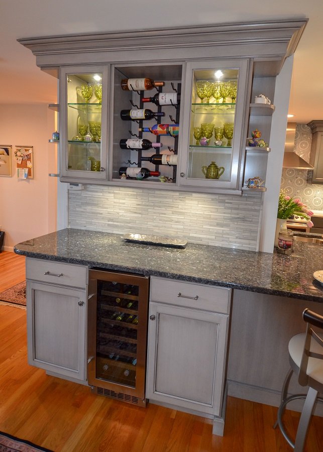 Built in wine racks along the bar area and open cabinets to showcase the homeowners decorations.