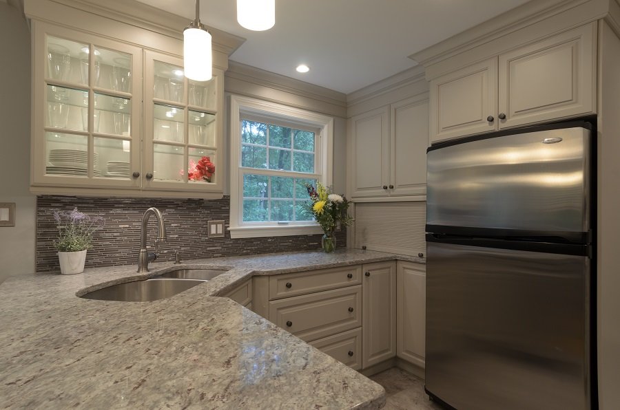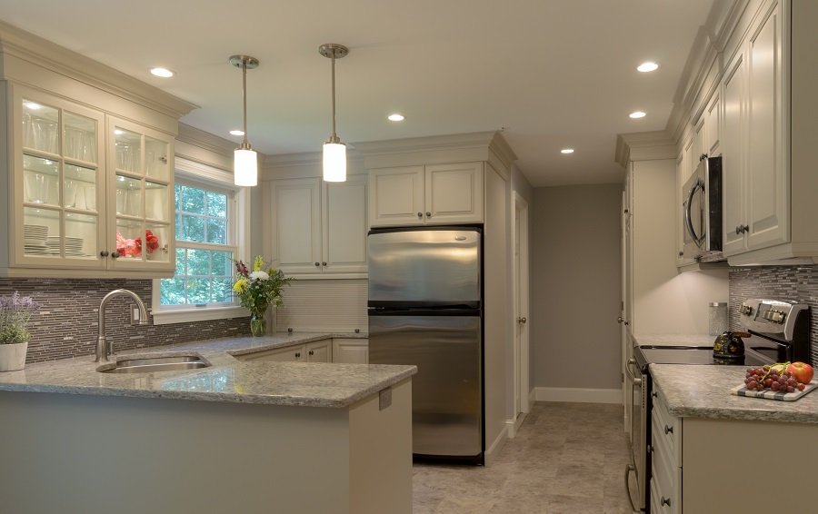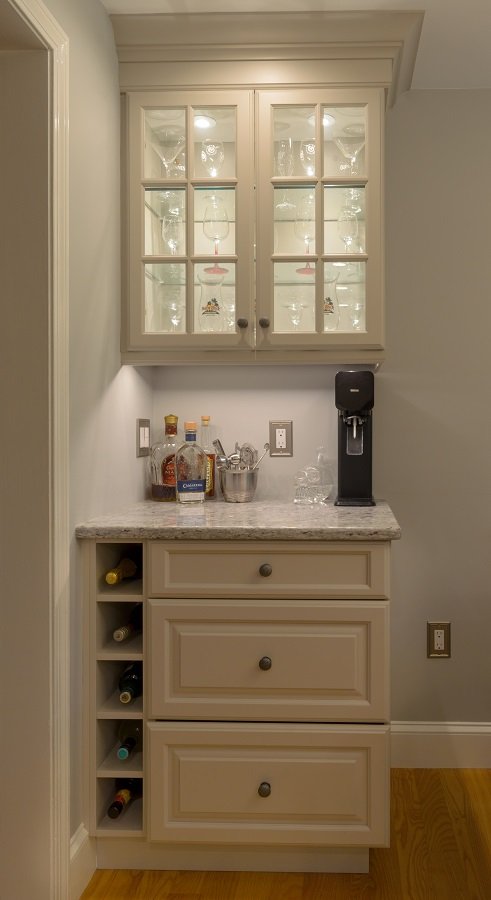 In this new Cherry kitchen remodel, Concord MA the warm brown tones and dark countertops contrast and work together to create movement throughout the kitchen design. The existing kitchen was small and closed in. As the designer worked with the homeowners it was unanimous that knocking down the wall was the right thing to do. It opened up the kitchen area and didn’t necessarily break the bank. The island works as a divider looking into the family room area but also works as a surface to prep food at, or eat at. In the island there is plenty of storage space. Throughout the perimeter of the kitchen design in Concord MA, there is plenty of storage space for large pots and pans, Tupperware, and appliances. The storage space is easily accessible and placed in a way that the homeowners don’t have to bend down or walk across the kitchen to get an extra pot or pan. There is plenty of overhead lighting and backsplash lighting to brighten up the room. During this kitchen remodel the homeowners also remodeled the mudroom and converted it into a laundry room and remodeled the bathroom.