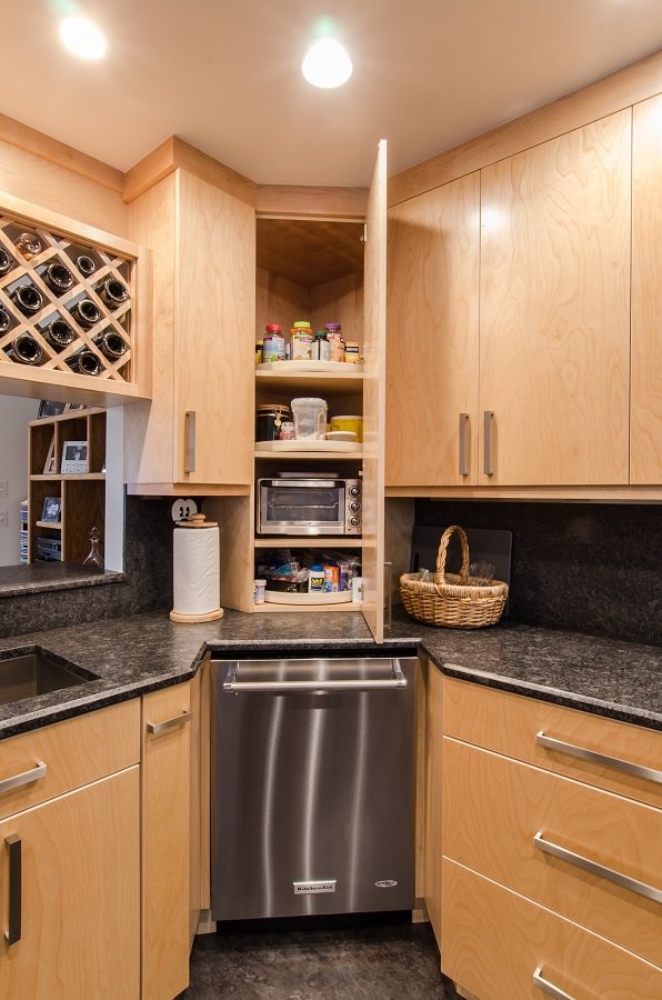 • Corner cabinet that goes to the counter is a great place to store small appliances and with the lazy susan finding what your looking for is a dream