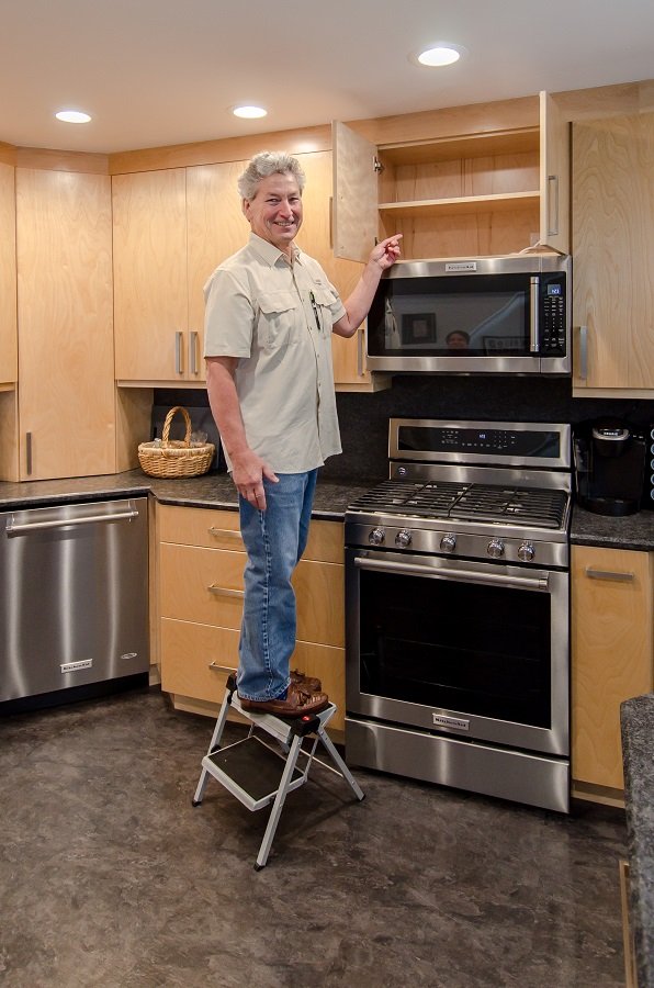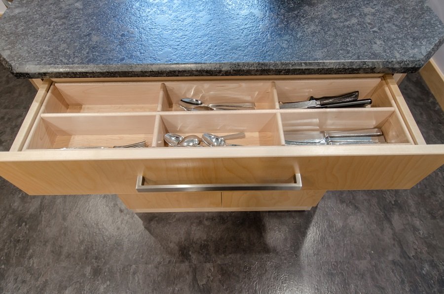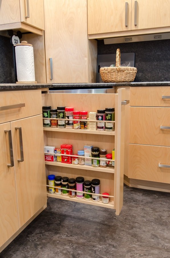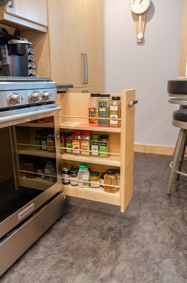 • Drawer storage added to kitchen with organization for spatulas and spices so everything has a place.
