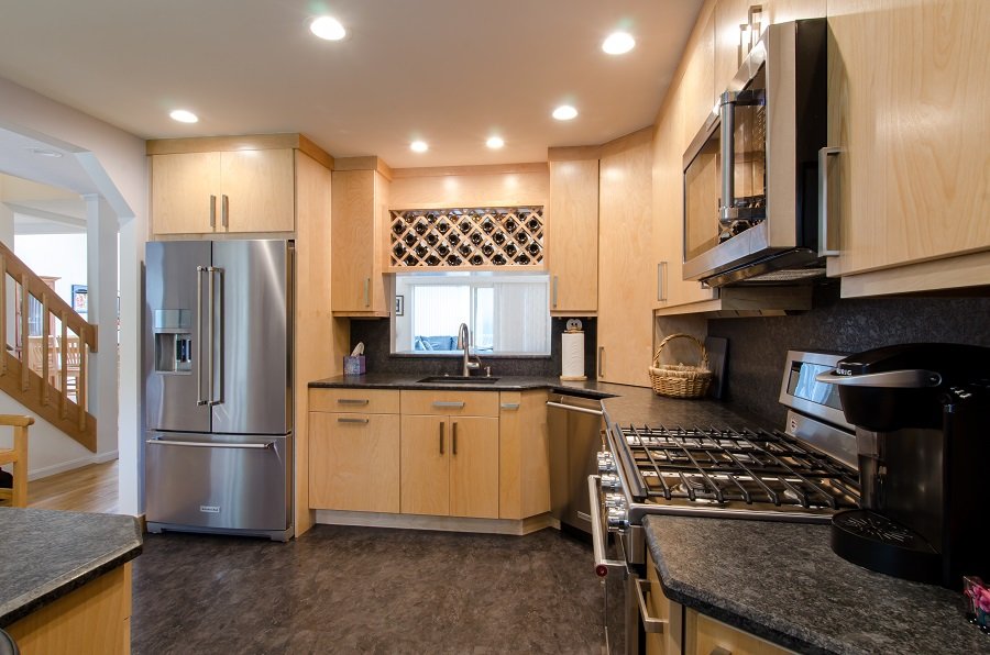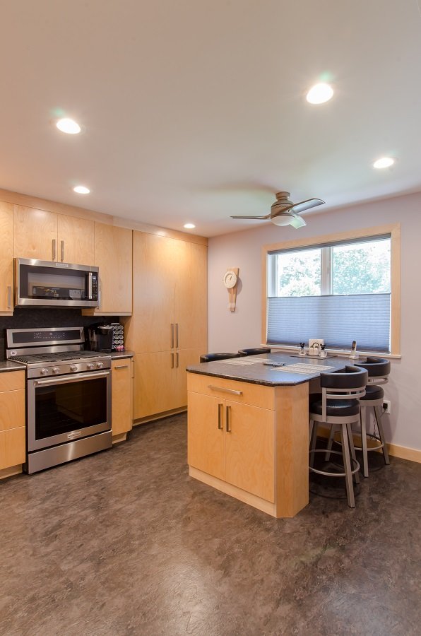 • Contemporary kitchen remodel in Wesford MA with birch cabinetry and granite countertop is a beautiful update to this Westford MA home.