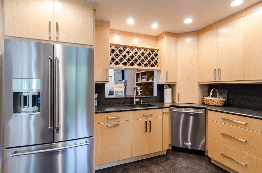 • Flat panel birch door with contemporary cabinet pulls and stainless steel appliances add to the contemporary look of this kitchen.