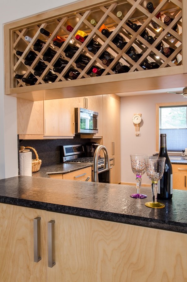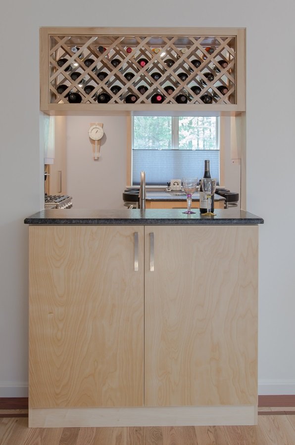 In summary – Contemporary kitchen remodel in Westford MA with flat panel doors and granite countertops is a fabulous addition to this Westford MA home. Built in island set like a table with storage is great and very practical. Lots of drawer storage in this kitchen so everything has its place. Granite countertops and backsplash give this kitchen a very sleek contemporary look. Corner cabinet and dishwasher is a great use of corner space and gives an element of design to the kitchen. Wine cubbies above the sink open to living space is a great use to the space and gives a stunning look.