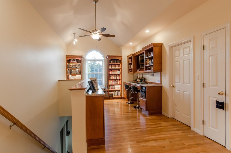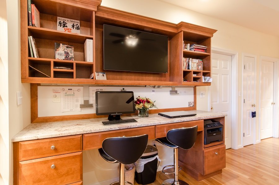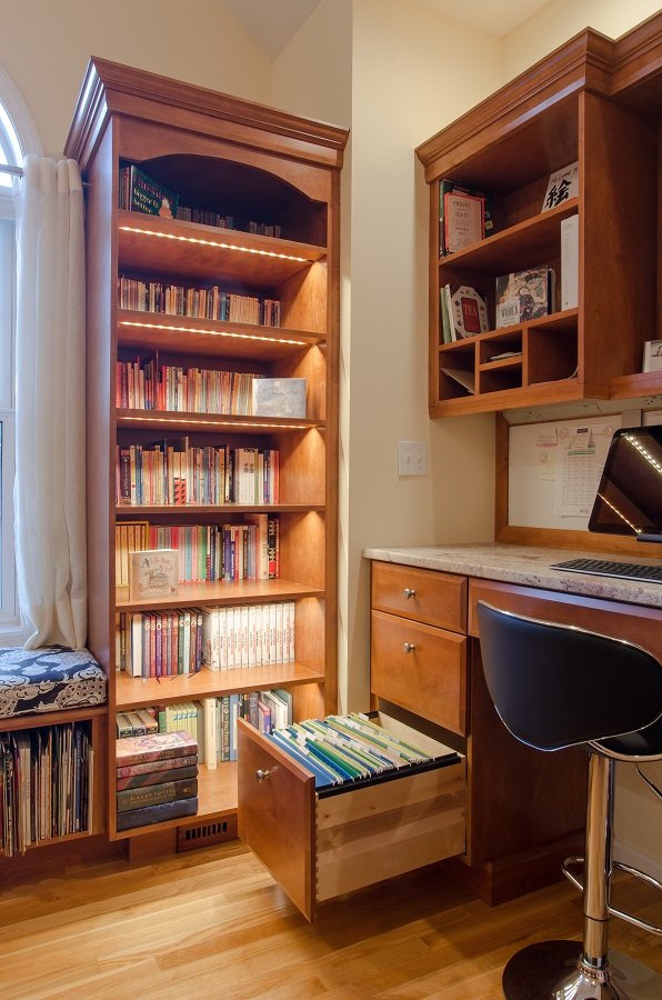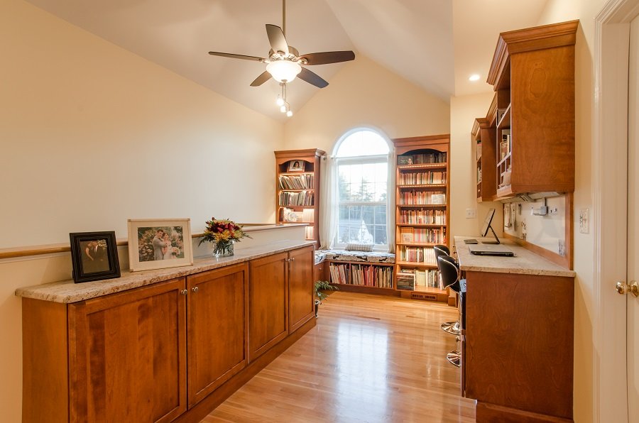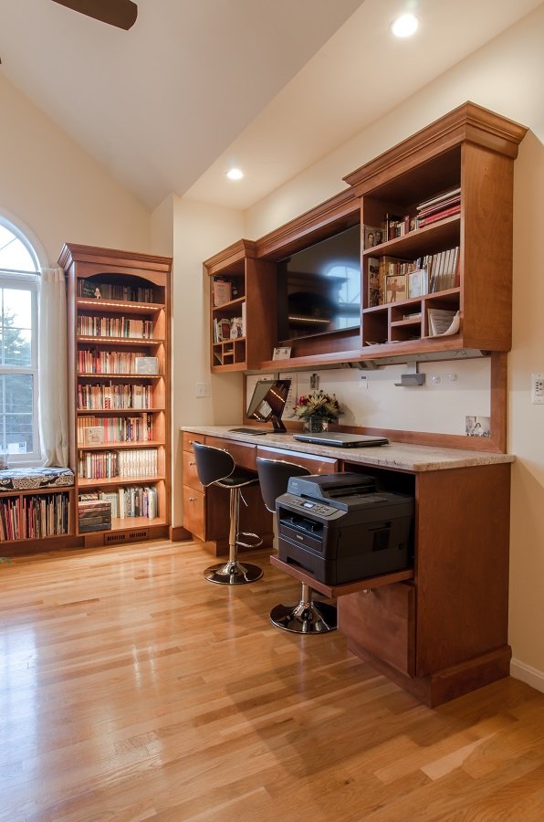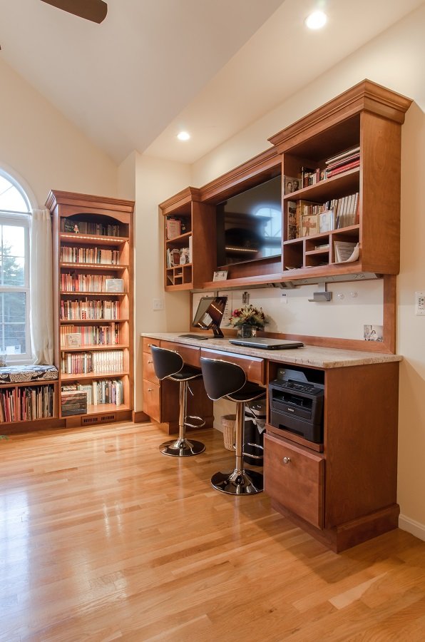 - Stained birch cabinetry and a honed yellow granite provide a stunning custom library in Hudson NH