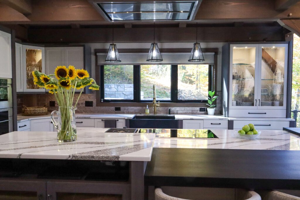 This white kitchen design is a dream come true! We set out to give this space an amazing makeover, starting with a fabulous white kitchen island. Featuring ample seating for up to five people, it also features a built-in stovetop, glass cabinets, and custom white cabinets. This stove orientation allows the cook to interact with family and guests. Plus this kitchen island keeps the family electronics charged since we tucked several electrical outlets within the island. Sleek black metal accents add an elegant touch to this white kitchen design! Whether you’re hosting your holidays or throwing a dinner party, this beautiful kitchen renovation will be the place to be!
