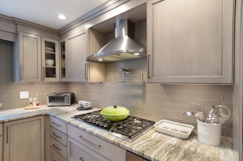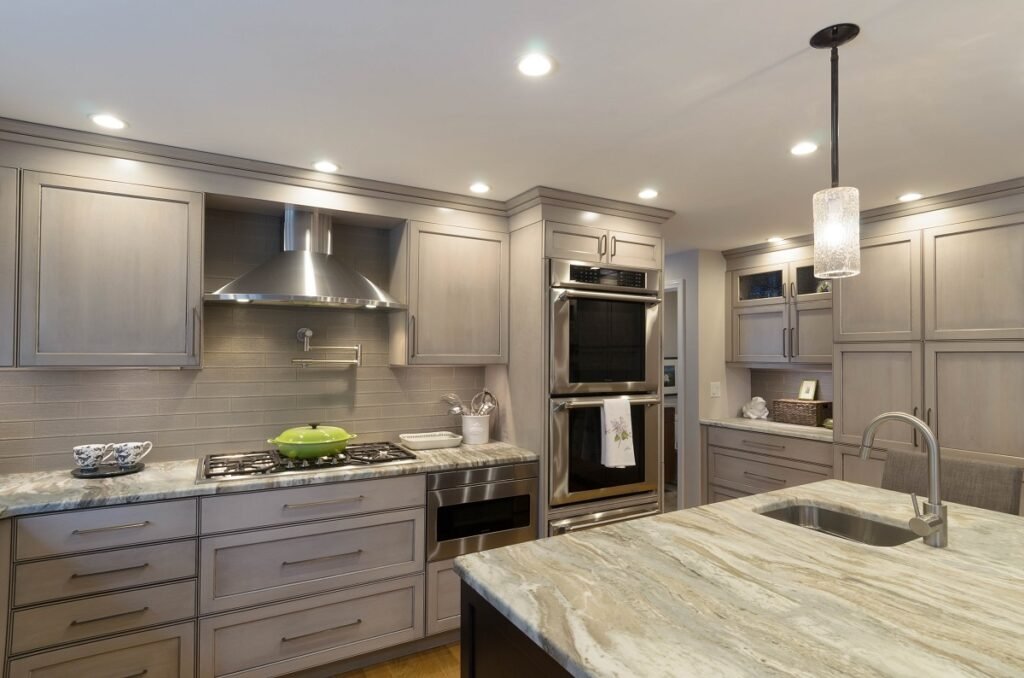 - Plenty of drawers and cabinets for storage space at hands reach in the new gray painted kitchen design in Groton MA.