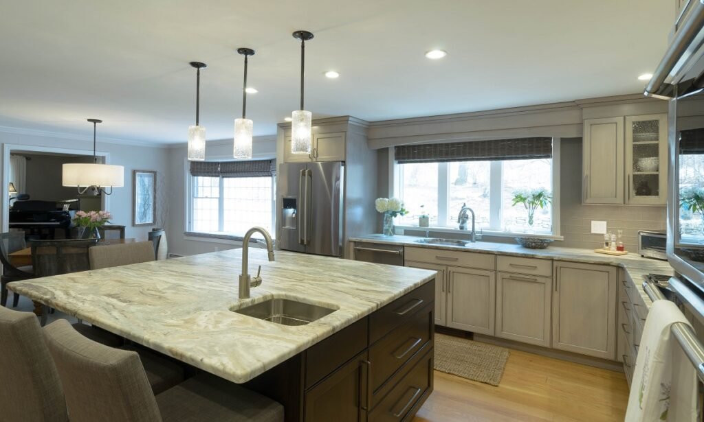 - Stunning pendant lights hanging over the island complement the overall style of the gray kitchen design in Groton MA