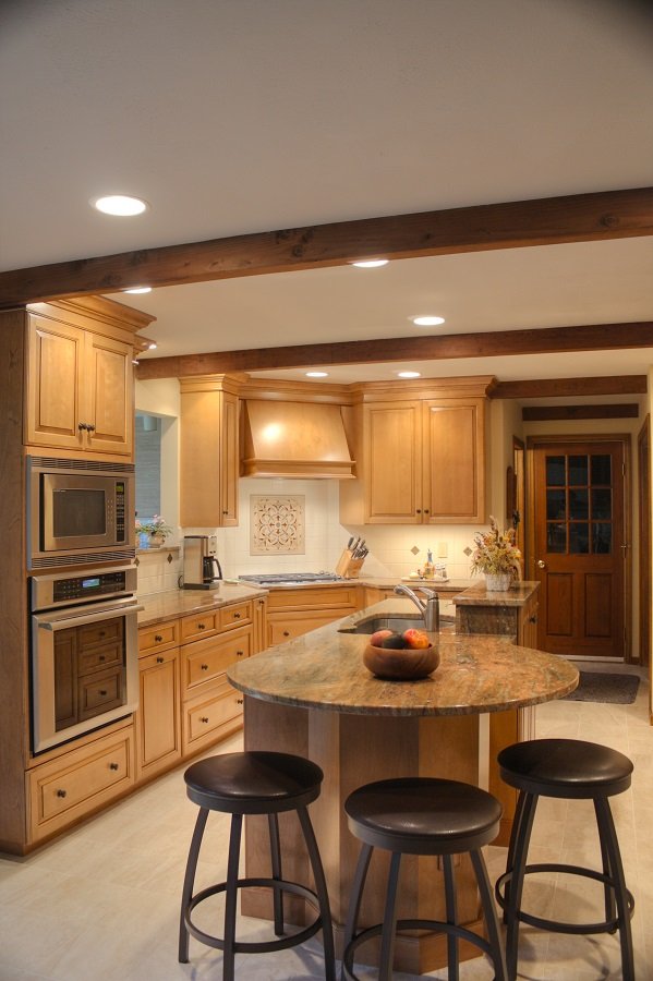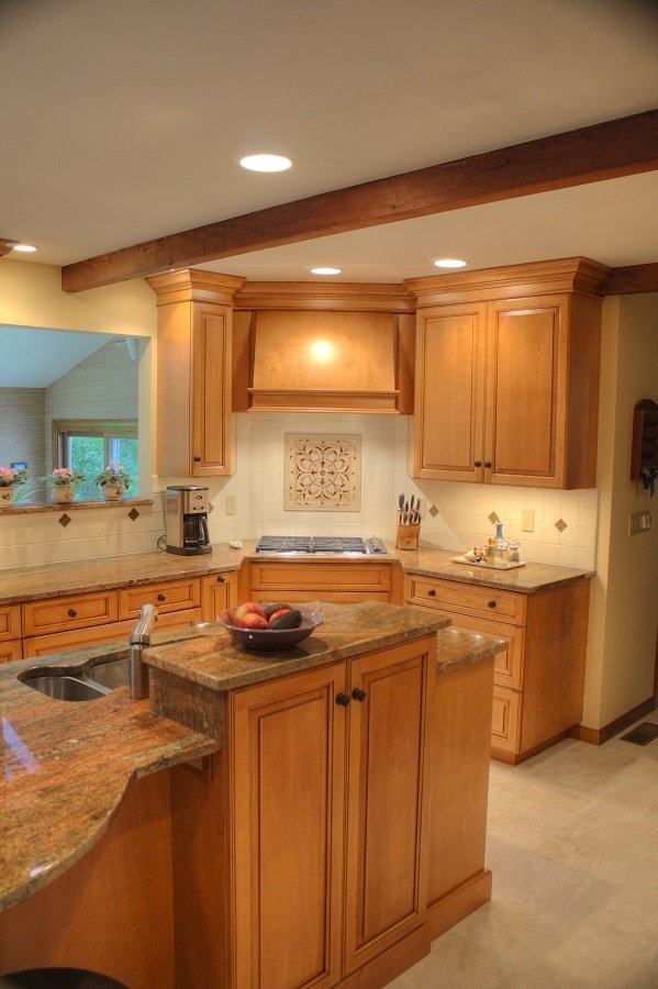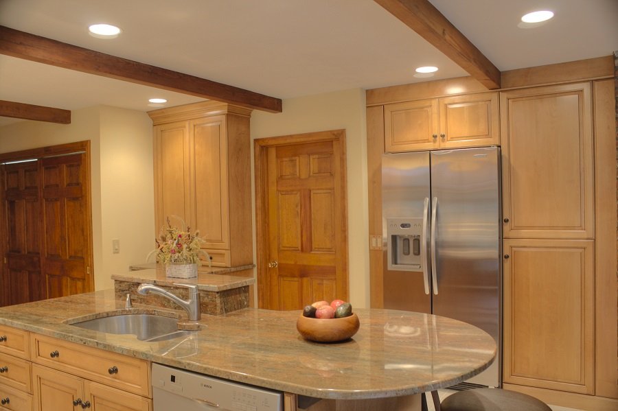 Adding plenty of recessed lighting makes this once dark space into a beautiful well lit kitchen.