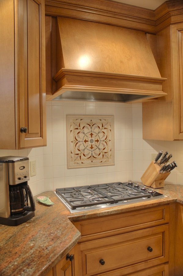 Adding a tile backsplash behind the range add an aspect of color that matches well with the granite but also brings in an element of interest.