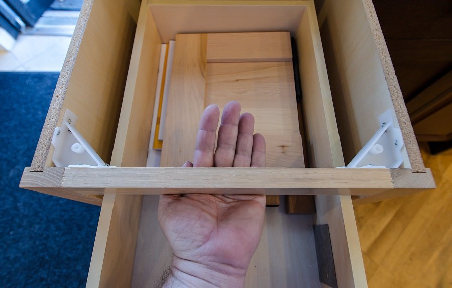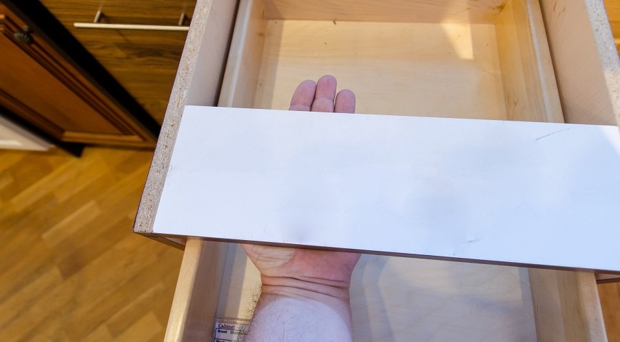Kitchen cabinet construction is all about the thickness of the walls and construction of the cabinet’s box. Cabinets should have 5/8” or thicker cabinet walls and have a 6” piece of wood in the top front and top back of the cabinet. Think of a cardboard box. It is very easy to twist that box one way or the other with a very little pressure. This is completely unacceptable in cabinet construction for obvious reasons. Cabinets need to be strong and stable. Granite which weighs in the neighborhood of 2,000 pounds will either crack or put so much pressure on the box of a cabinet that the door and drawers will not function properly. This is called racking.