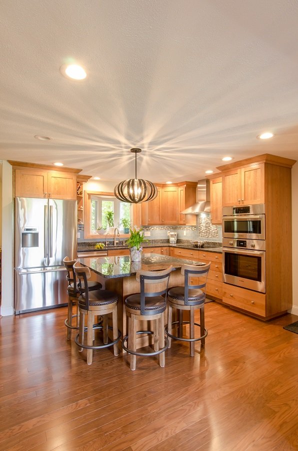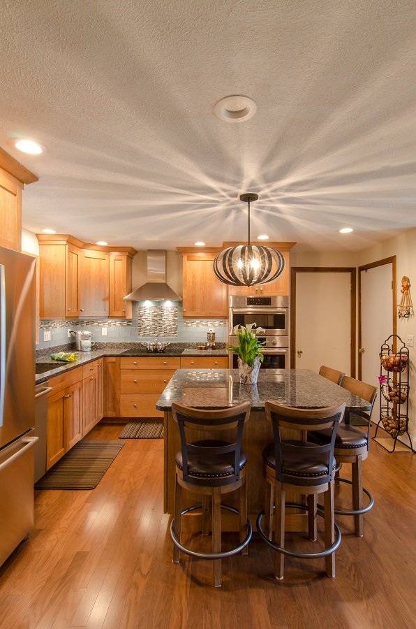 - Lots of recessed lighting along with windows and hanging light on the center of the island gives this kitchen remodel in Acton MA plenty of light.