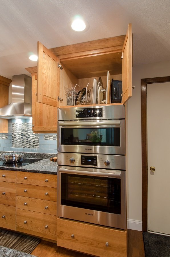 - Built in stainless steel appliances with a induction cooktop provide a sleek look for this transitional kitchen.
