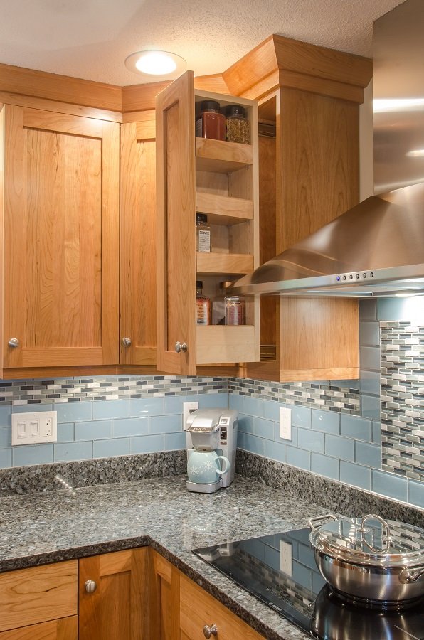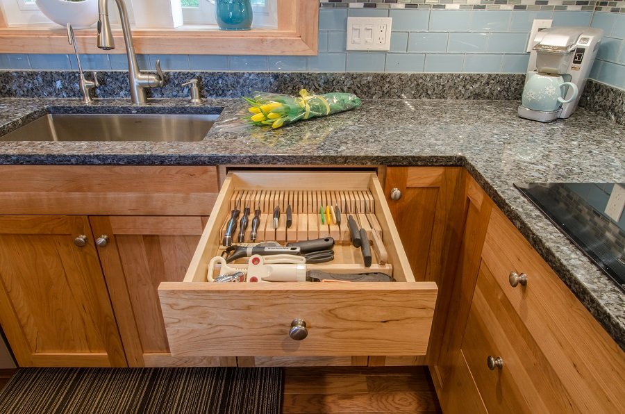- Drawer storage added to kitchen with organization for spatulas and spices so everything has a place.