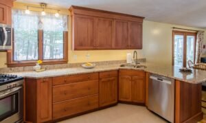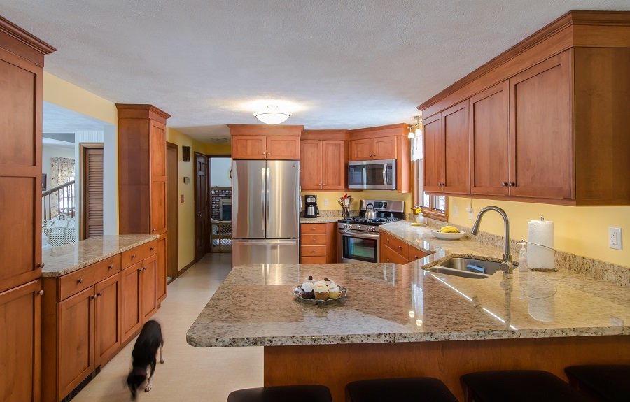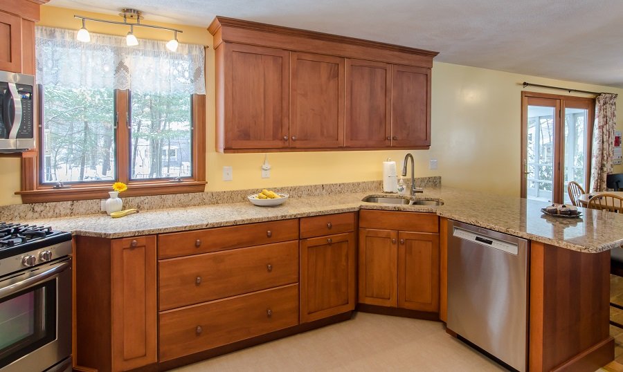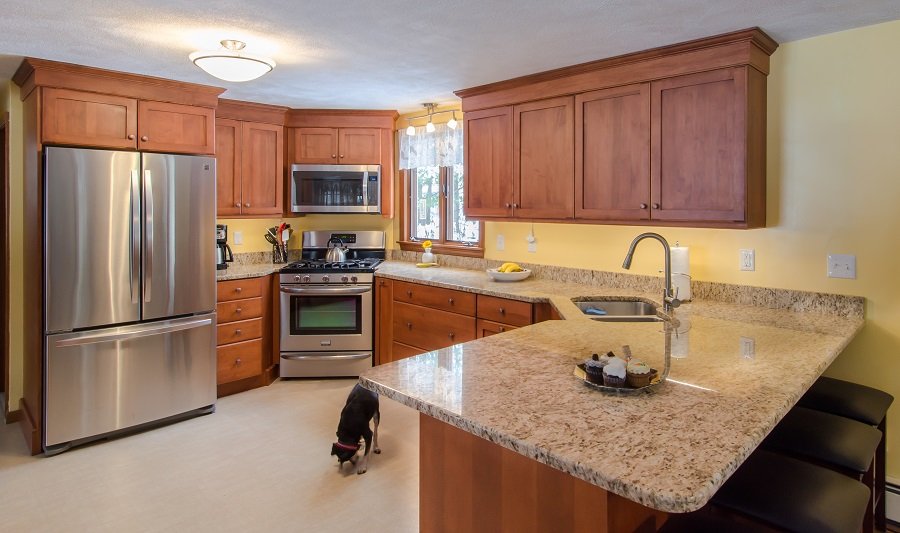 Stained wood shaker style cabinetry provide a nice clean look to this kitchen remodel in Acton MA
