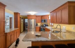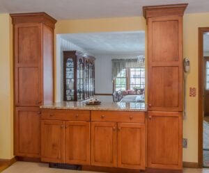 In summary – Stained wood cabinetry with granite countertops give a nice clean look to this kitchen remodel in Acton MA. Lots of cabinet storage for not only food but pots and pans as well. Seating area at peninsula is a great place for a quick meal or chatting to the cook while they’re prepping the meal. Buffet area thats open up to the dining room is perfect for entertaining. Pantry storage framing the buffet really adds a nice finishing touch to this kitchen remodel in Acton MA