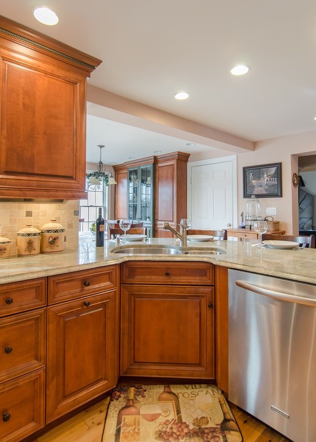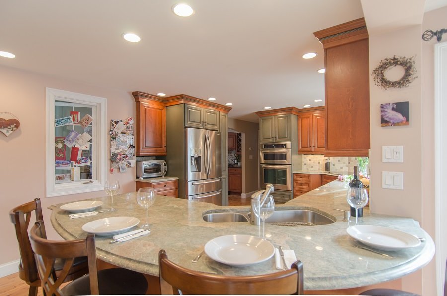 | Kitchen Remodel in Burlington MA Two toned cabinetry was a beautiful touch to his kitchen remodel in Burlington MA Corner cooktop and sink are a great use of corner space and provide a great amount of countertop space for this kitchen remodel in Burlington MA. Lots of drawer storage added to kitchen with organization for spatulas and spices so everything has a place. Plenty of cabinet storage for pots, pans, mixing bowls, Tupperware, serving dishes, small appliances and anything else the owner could need. Lovely curved seating area for four people, perfect for conversation in this kitchen remodel in Burlington MA Corner sink space that is opened up to the dinning room letting whomever is in the kitchen still be apart of dining room conversation. A subtle tile backsplash really adds to this kitchen remodel in Burlington MA Pantry area in the dining room with a glass display area add a stunning element to the space and ties in the kitchen area to the space. Stunning green granite really compliments the two toned cabinetry in his kitchen remodel in Burlington MA. |