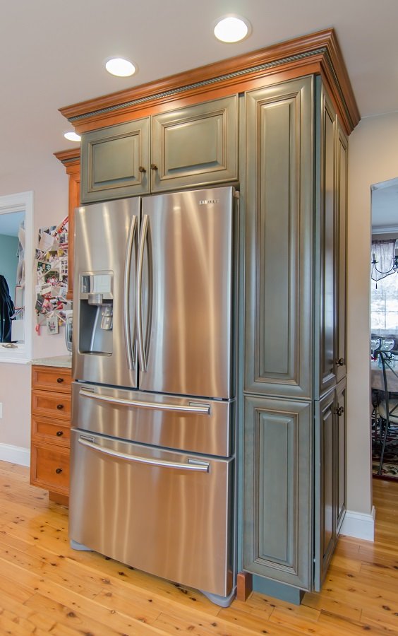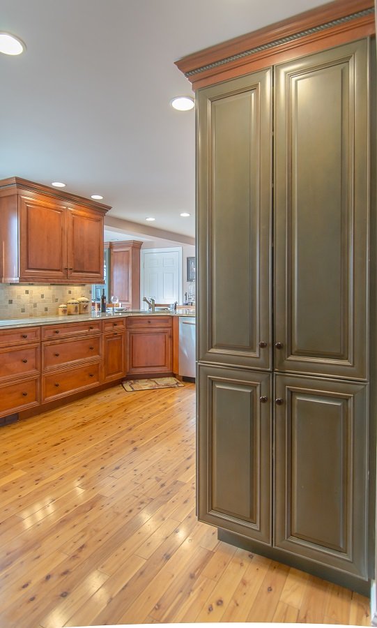 | In summary –Two toned cabinetry with a green granite really add an element of color to this kitchen remodel in Burlington MA. Corner cooktop and sink provide massive amounts of countertop work space as well as a great utilization of the corners. Adding drawers provides the homeowner with a great about of storage and a place to store all their kitchen goods. Pantry in the dining room adds a beautiful element as well as a great area to display goods. |
