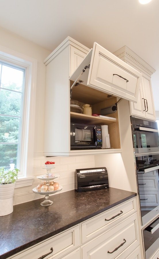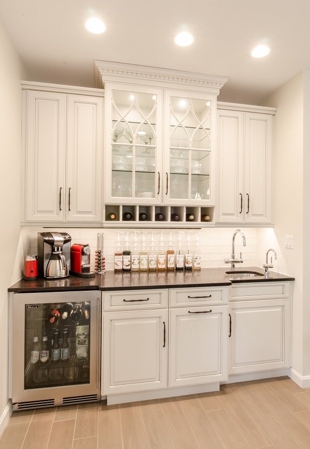 In summary – This kitchen remodel in Chelmsford MA provides a stunning traditional look while still being very functional. Large island provides not only seating for six but a gorgeous display cabinet with custom mullions. Playing with highs and lows as well as using a custom wood hood adds to the traditional look of this kitchen remodel.