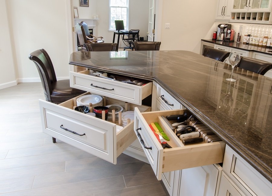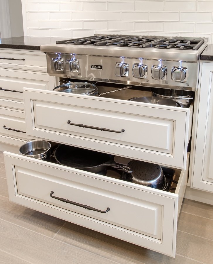 • Drawer storage added to kitchen with organization for spatulas and spices so everything has a place.