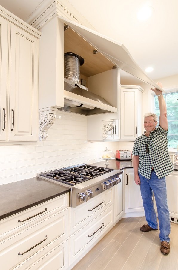 • Custom wood hood made out of matching cabinetry and corbels add a lovely traditional touch.
