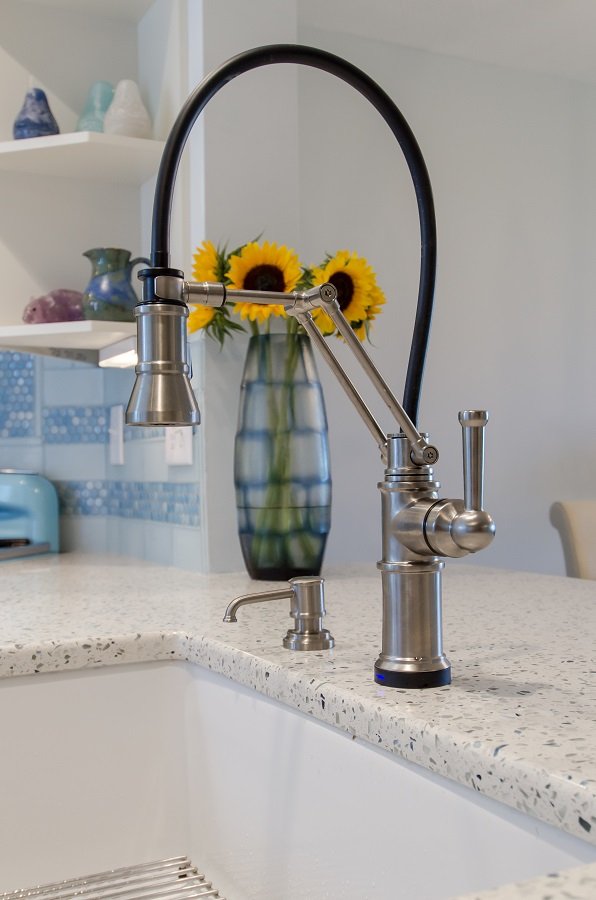 - recycled glass quartz countertop adds to the beach look while complimenting the blue of the appliances