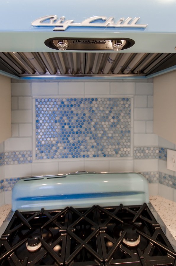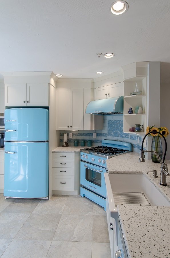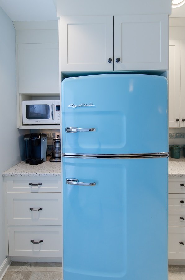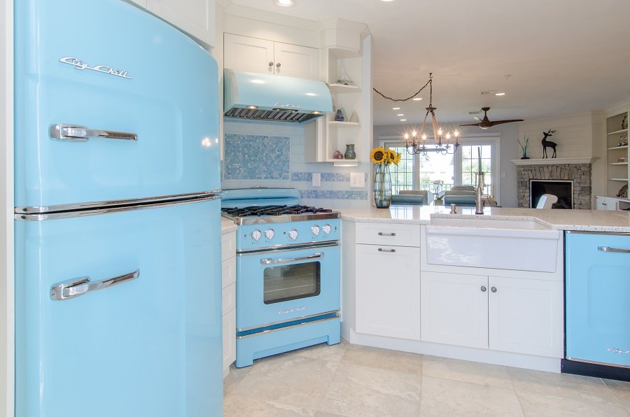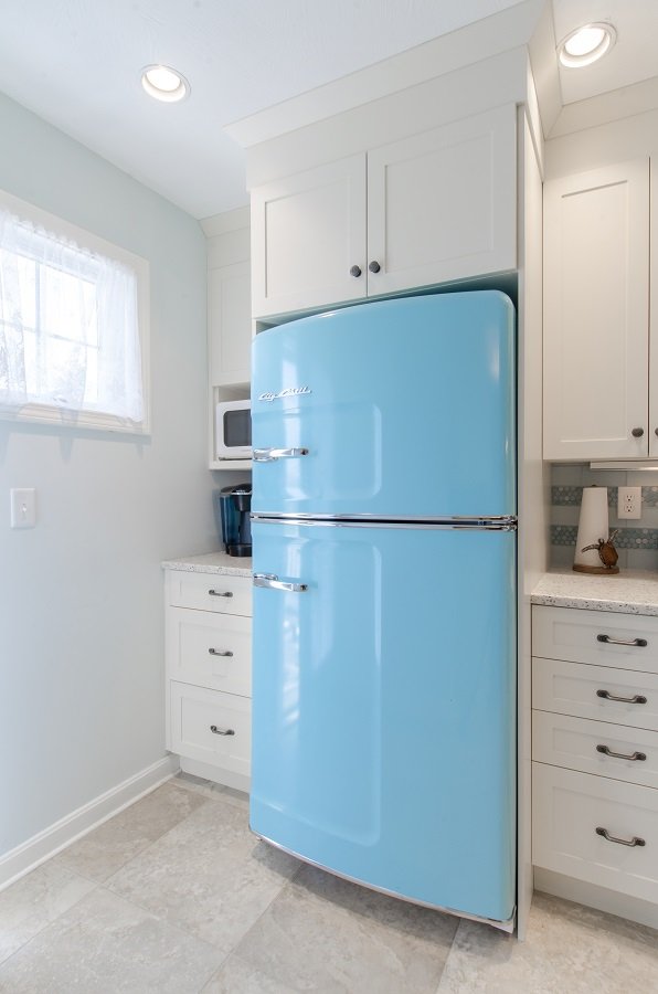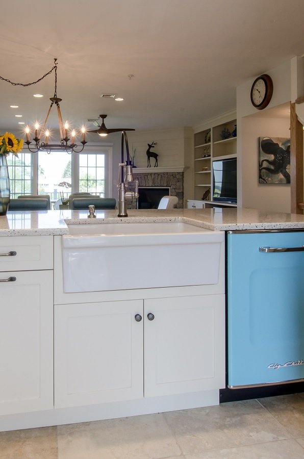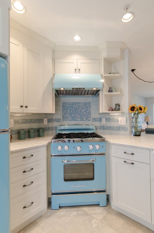 | In summary – Kitchen remodel in Salisbury MA with white cabinetry and retro blue appliances adds a stunning look to this beach house. Extra cabinet storage so everything has a place. Lots of recessed lighting to make the space bright and inviting. Sink facing out to the dining area allows the cook to still be apart of the conversation. Blue appliances and accent tile provide a beautiful addition of color to add to the beach theme in this kitchen remodel in Salisbury MA |