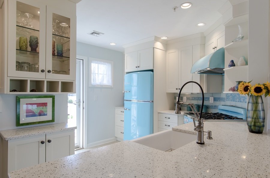 - White painted cabinetry with recycled glass countertop and retro blue appliances provide a beautiful beach look kitchen remodel in Salisbury MA.