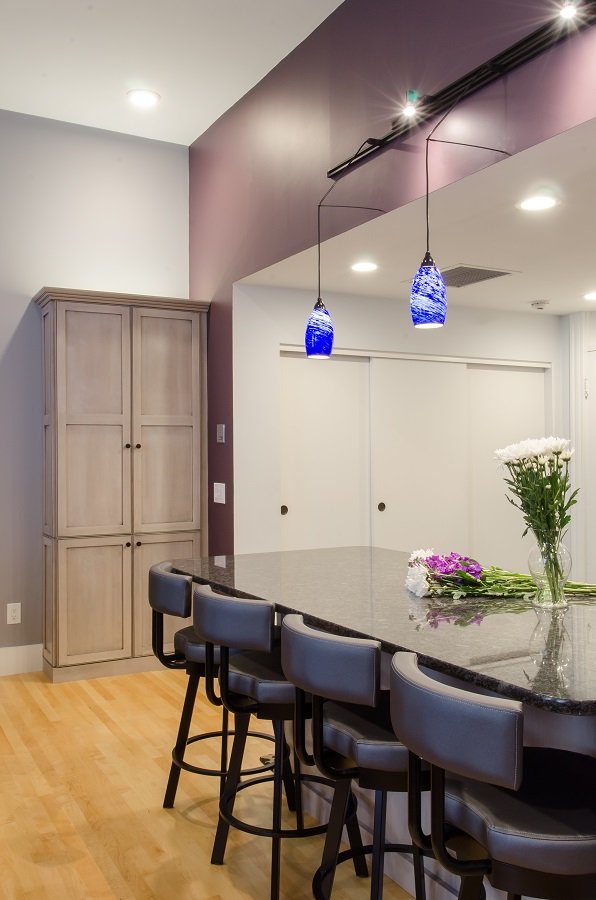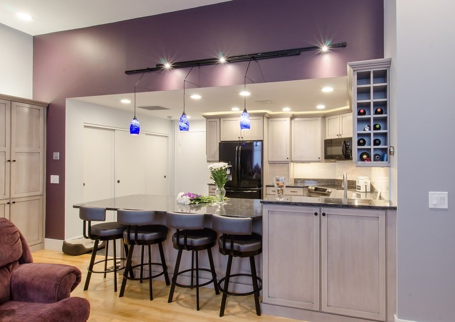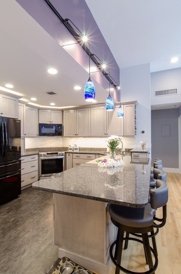 - Large open kitchen space with gray cabinets and dark gray countertops is a stunning addition to this kitchen remodel in Somerville MA