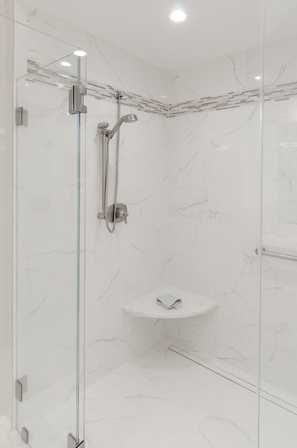 • Grand tile shower with corner shower seat, custom glass doors and built in shower cubbies.