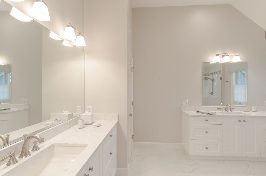 • His and hers vanities allow for each person to have their own separate area in the bathroom.