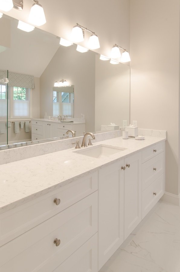 • White quartz countertops the overall crisp white theme in this bathroom.