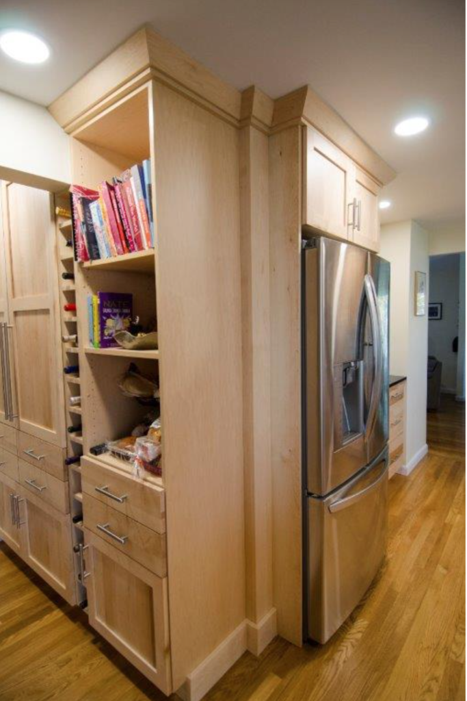 Around the corner is your perfect multipurpose space. The entire wall is all storage, storage, storage! From a mixture of cabinets, drawers, and shelves, this space can serve as your storage space for groceries, cookbooks, glassware, or other decorations. We even installed a large column of wine cubbies.