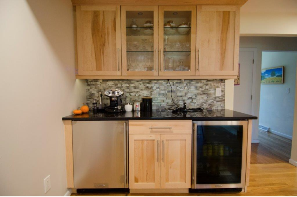 A built-in bar station sits on the right side of the fridge. A beautiful mosaic tile backsplash is the feature piece. This is the perfect area for you to make a drink or make a cup of coffee. Just grab a glass from the glass paneled cabinet and fill it up.