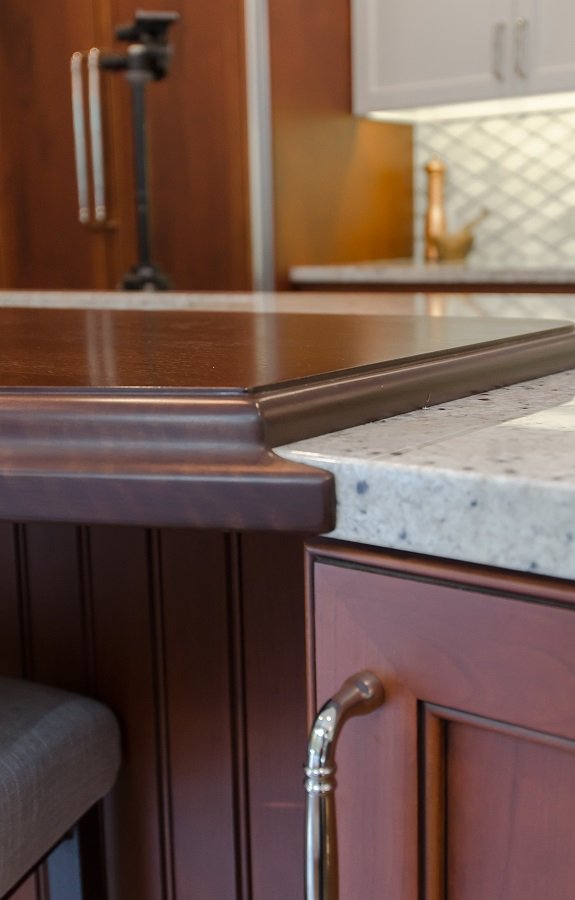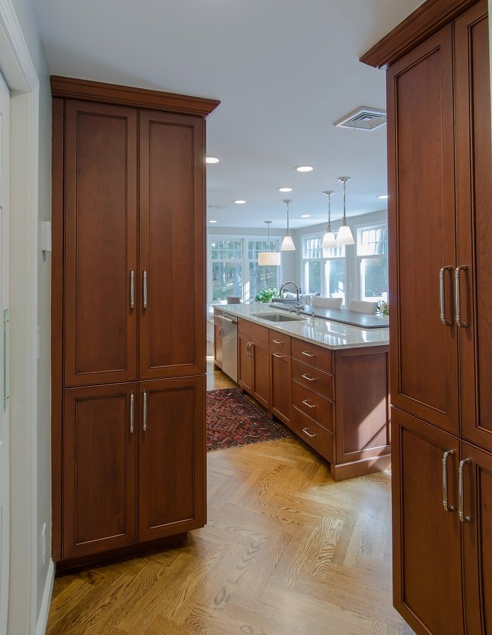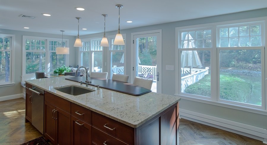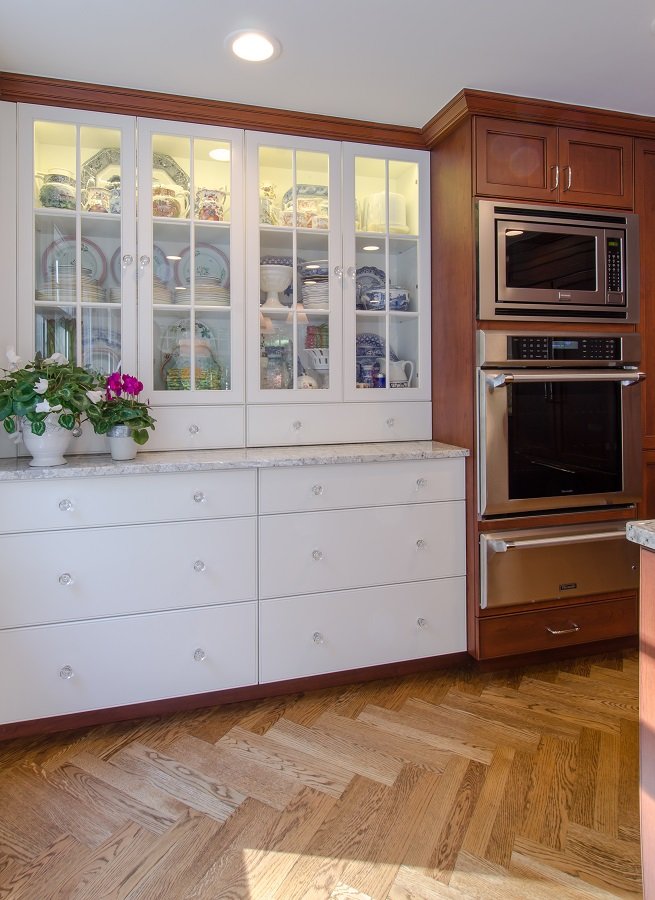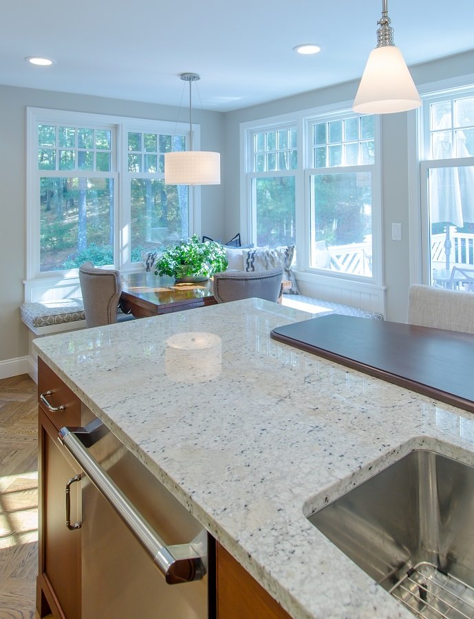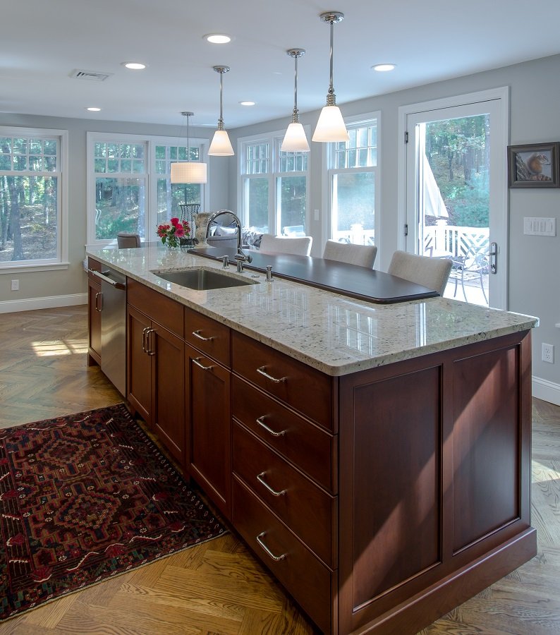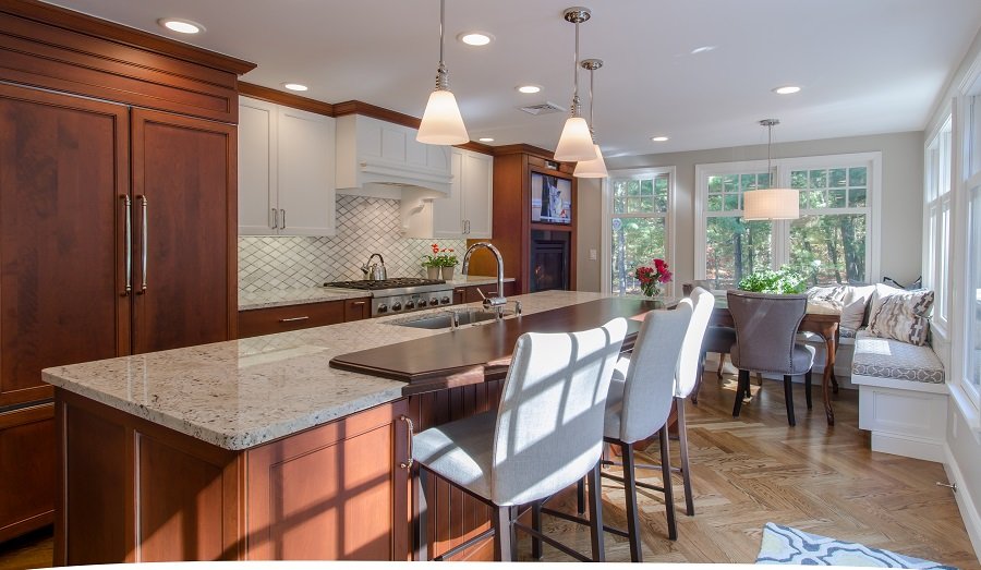 | Lincoln MA Kitchen Remodel Two toned cabinetry adds a beautiful element to this Lincoln MA kitchen remodel Sink in the island gives the cook the ability to talk to people in the breakfast nook and look outside to the backyard. Lots of drawer storage added to kitchen with organization for spatulas and spices so everything has a place. Plenty of cabinet storage for pots, pans, mixing bowls, Tupperware, serving dishes, small appliances and anything else the owner could need. Island has both granite and a wood top at the eating area in this Lincoln MA kitchen remodel Built in breakfast nook set next to a built in tv/fireplace unit provides a nice cozy spot to relax in this Lincoln MA kitchen remodel Stunning simple backsplash tile adds to the this kitchen space. Light granite countertops compliment the dark stained cherry cabinets but look nice to the white wall cabinetry. Large glass display area for china with drawers below for any additional storage is a perfect compliment to this Lincoln MA Kitchen |