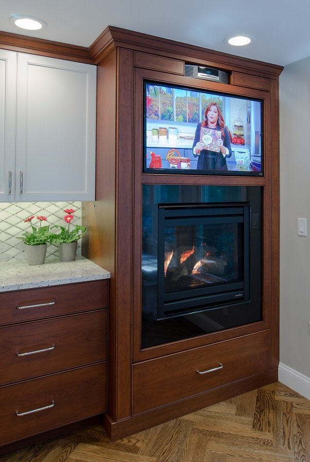 | In summary – Two toned cabinetry adds a stunning element to this Lincoln MA kitchen remodel. Drawer storage to either side of the cooktop is perfect for the cook to have everything at their fingertips. Light granite with a stained dark wood piece on the island add a great design element. The built in tv/fireplace unit in the kitchen adds an great element of coziness to the space. |