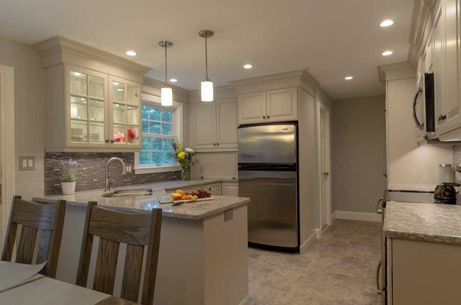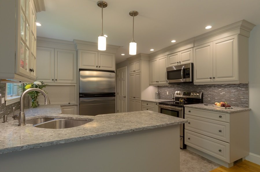 In this new two toned shaker kitchen remodel in Dunstable MA the designer not only designed the kitchen but designed the bathrooms, mudroom and laundry room while the new home was being built. A designer from Dream Kitchens designs more than just the kitchen when they’re working with homeowners on a job. They will think about the layout and what rooms interact with the kitchen so the home flows and functions efficiently. When you enter the new home the mudroom flooring is tiled with porcelain tiles. This is a great space for an easy to clean up after a rainy New England day. In the mudroom there are floor to ceiling open cubbies built in with baskets to store all of your seasonal items. The Laundry machines have a new wood countertop that creates a surface area to fold your close at. In addition there is a beautiful Mediterranean themed porcelain backsplash that adds warm color tones to the space. The mudroom opens up into the kitchen designs. In the center of the kitchen there is a two toned blue and white island that stretches across the floor plan. The island has plenty of storage built in with soft close drawers. The cabinets in the kitchen are white toned shaker style. Throughout the home the designer kept the shaker style cabinetry but changed the color tones throughout. There is plenty of recessed and pendent lighting throughout the whole home and especially in the kitchen so the chiefs can see what their cooking.