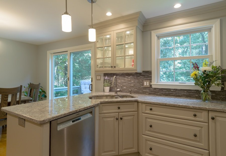 • Plenty of soft close drawers and cabinets for storage space at hands reach in the shaker kitchen Dunstable MA.
